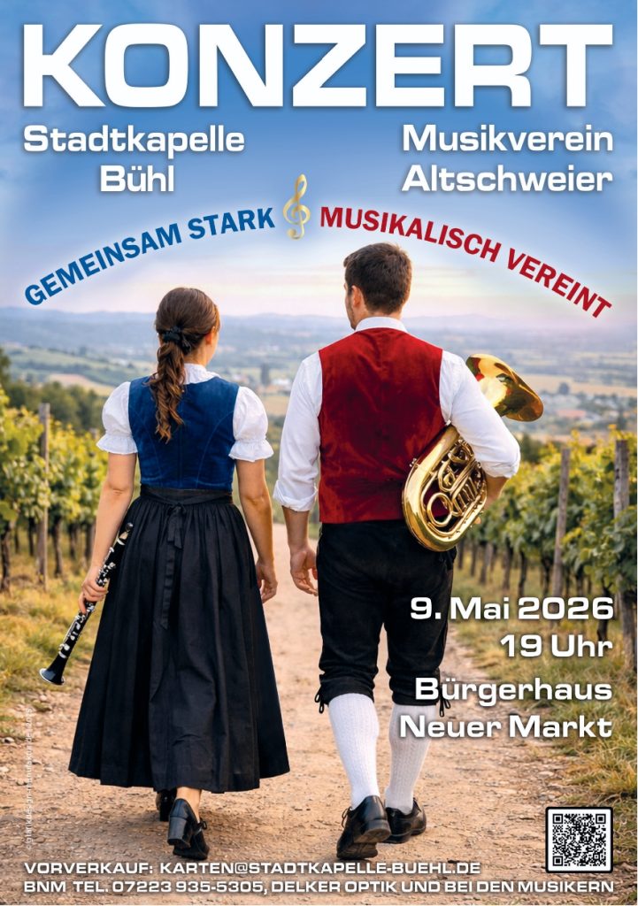Kartenvorverkaufsstellen sind das Bürgerhaus Neuer Markt in Bühl, Delker Optik in der Hauptstraße 46 in Bühl, die Raiffeisenbank Altschweier sowie das Autohaus Meier in der Bühlertalstraße 177 in Altschweier. Darüber hinaus sind Karten bei allen Musikerinnen und Musikern erhältlich. Auch eine Bestellung per E-Mail unter karten@stadtkapelle-buehl.de ist möglich. Der Eintrittspreis beträgt 12 Euro, Kinder bis 12 Jahre haben freien Eintritt. Kinderkarten sind ausschließlich an der Abendkasse erhältlich. Freie Platzwahl. Einlass ab 18:15 Uhr. Weitere Informationen zur Stadtkapelle und des Musikvereines Altschweier finden Sie unter www.stadtkapelle-buehl.de, www.musikverein-altschweier.de sowie auf den Social-Media-Kanälen bei Facebook und Instagram.